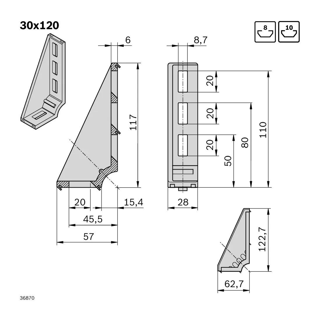 Kątownik fundamentowy 30x120 Bosch Rexroth to element montażowy stosowany w różnorodnych konstrukcjach przemysłowych i modułowych, gdzie wymagana jest stabilność oraz precyzyjne połączenie.