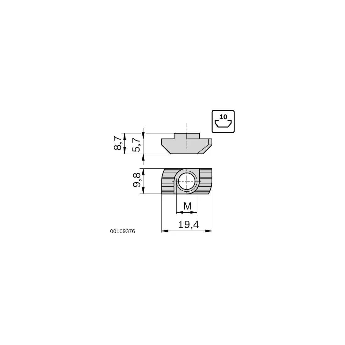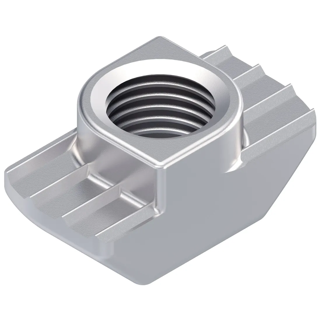 Nakrętka młoteczkowa M8 [10] jest powszechnie używana do połączeń, dzięki możliwości łatwego umieszczania w rowkach roboczych profili aluminiowych. Najczęściej stosowana jako element montażowy kątowników, przegubów i innych komponentów.