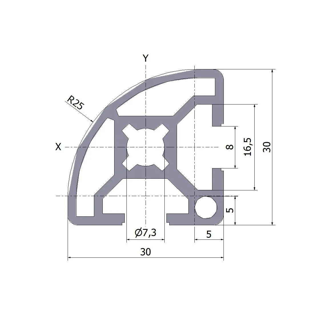 Profil aluminiowy 30x30 R z serii „30” jest idealnym rozwiązaniem do konstrukcji o średnim obciążeniu. Dzięki zaokrąglonym kształtom profil nie tylko zapewnia estetyczny wygląd, ale także zwiększa bezpieczeństwo i komfort użytkowania poprzez eliminację ostrych krawędzi. Najczęściej stosowany jest do budowy stelaży przenośników, małych wózków podręcznych oraz ramek nośnych.
