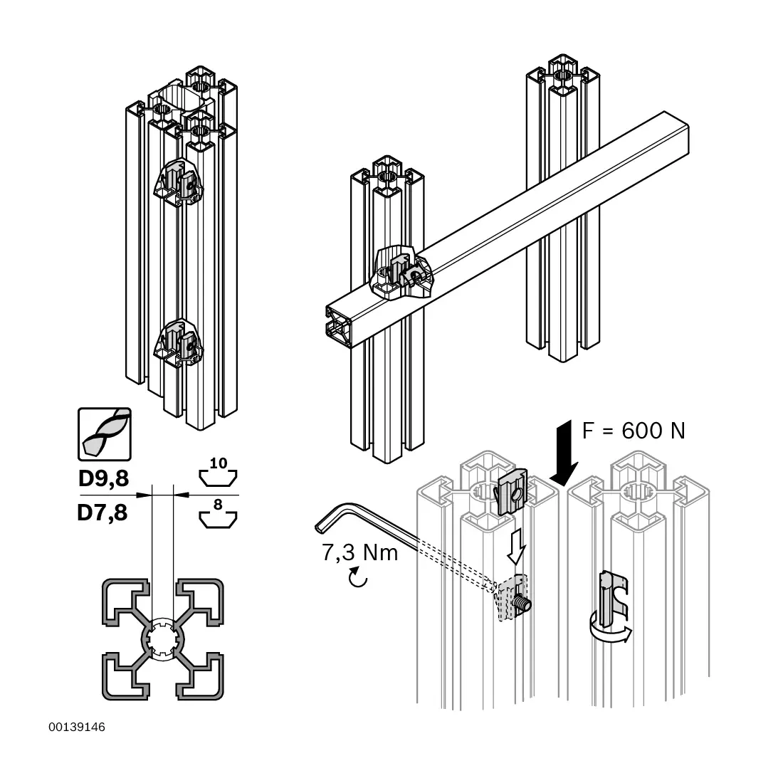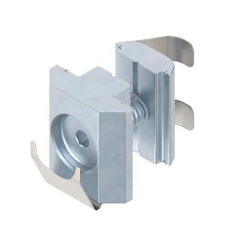 Łącznik równoległy [8] służy do precyzyjnego i bezszczelinowego łączenia dwóch profili nośnych, umożliwiając ich ustawienie równolegle lub pod dowolnym kątem. Jest idealny do budowy stanowisk roboczych, systemów regałowych, ram i innych struktur, gdzie ważne są estetyczne i solidne połączenia.